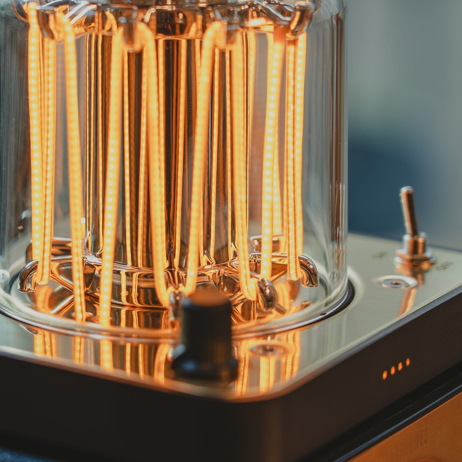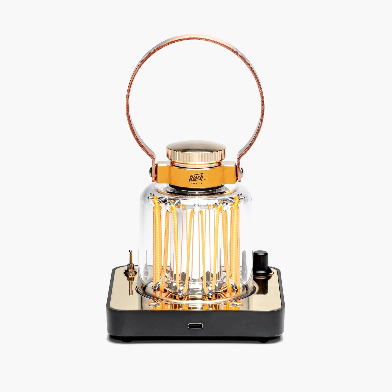 A completely unique, vintage-inspired rechargeable lantern. Beautiful LED wires emit a soft warm glow under the durable curved lens. A large copper finished handle allows for easy movement from place to place. Use it alone or stacked on top of our Block Tower Speaker and/or Block Tower Power Station. Made with real brass for a quality look and feel.
